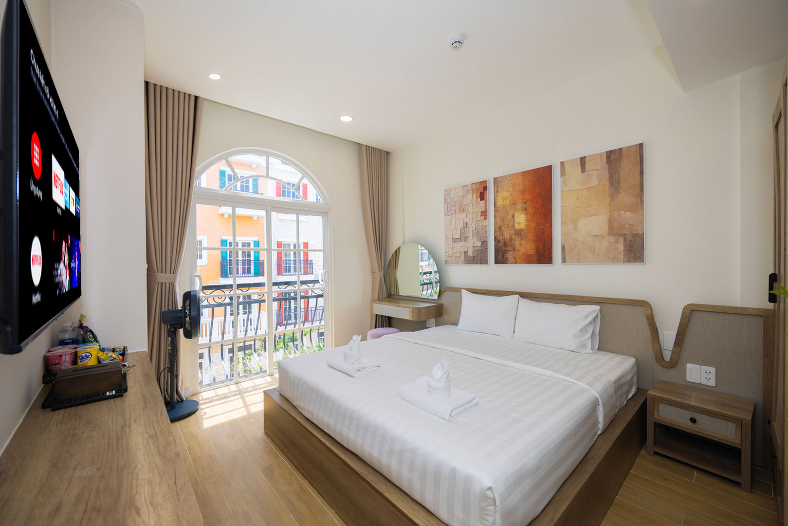 A spacious king room with warm beige tones and natural wood finishes, enhanced by minimalist furniture and elegant rattan accents. The room features a large king-sized bed, a private balcony for fresh air and city views, and a modern bathroom with a relaxing bathtub. Perfect for couples or families with young children seeking both comfort and elegance.